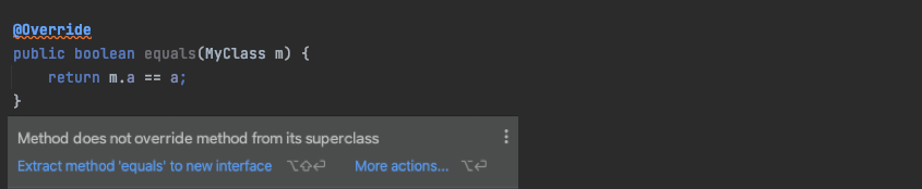 public boolean equals(MyClass m) { return m.a == a; }