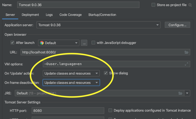 VM options에-Duser.language=en이라고 입력해줍니다. 또On 'Update' action과On frame deactivation을Update classes and resources로 설정하면 클래스파일이나 JSP파일이 변경되었을 때 자동으로 서버에 배포해줍니다.