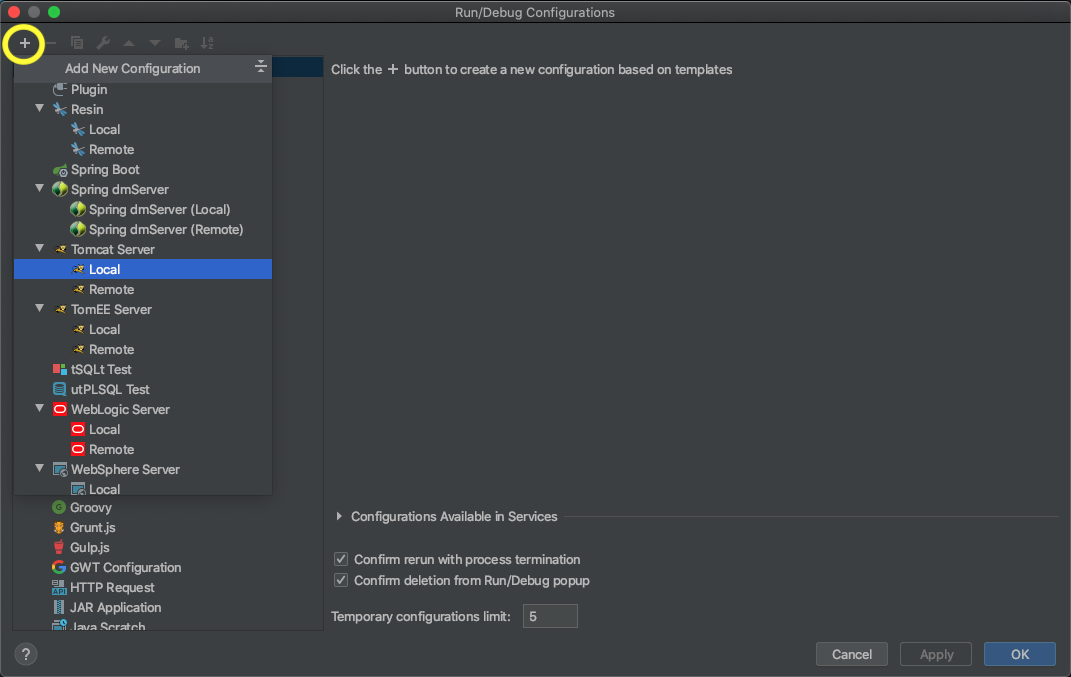 Run/Debug Configuration창 좌측 상단의+버튼을 클릭,Tomcat Server > Local을 선택합니다.