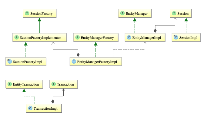 JPA의 핵심인 EntityManagerFactory, EntityManager, EntityTransaction을 각각 SessionFactory, Session, Transaction으로 상속받고 각각 Impl로 구현하였습니다.