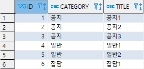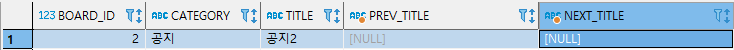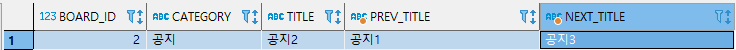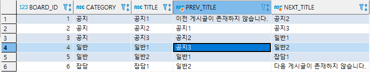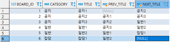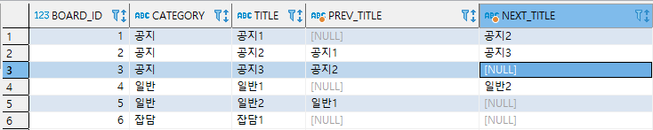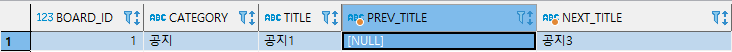 3, 4번째 행을 보면 공지3의 next_title은 null이고 일반1의 prev_title도 null로 바뀐 것을 알 수 있습니다.
